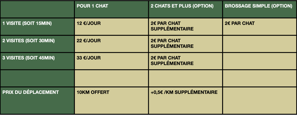 Pour rester cocooning et familial, je vous propose de rester 15 à 30 minutes chez vous pour les chats en fonction des options choisies et 30 minutes minimum pour les chiens. Cela me permettra de me consacrer réellement à leur bien-être. (Présence humaine, caresse, temps accordé pour eux, jeux, hygiène de vie et sorties pour les chiens…).